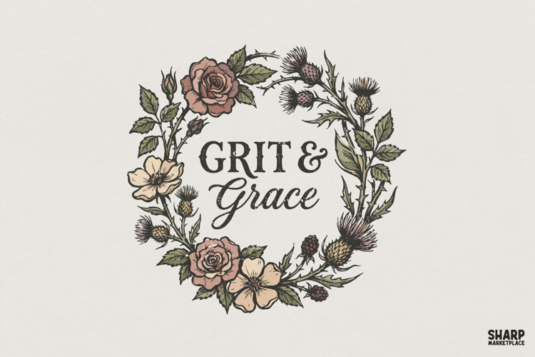 Grit & Grace PNG Floral Wreath, Inspirational Quote Shirt Design, Wildflower Vintage Art, Motivational Digital Download PNG