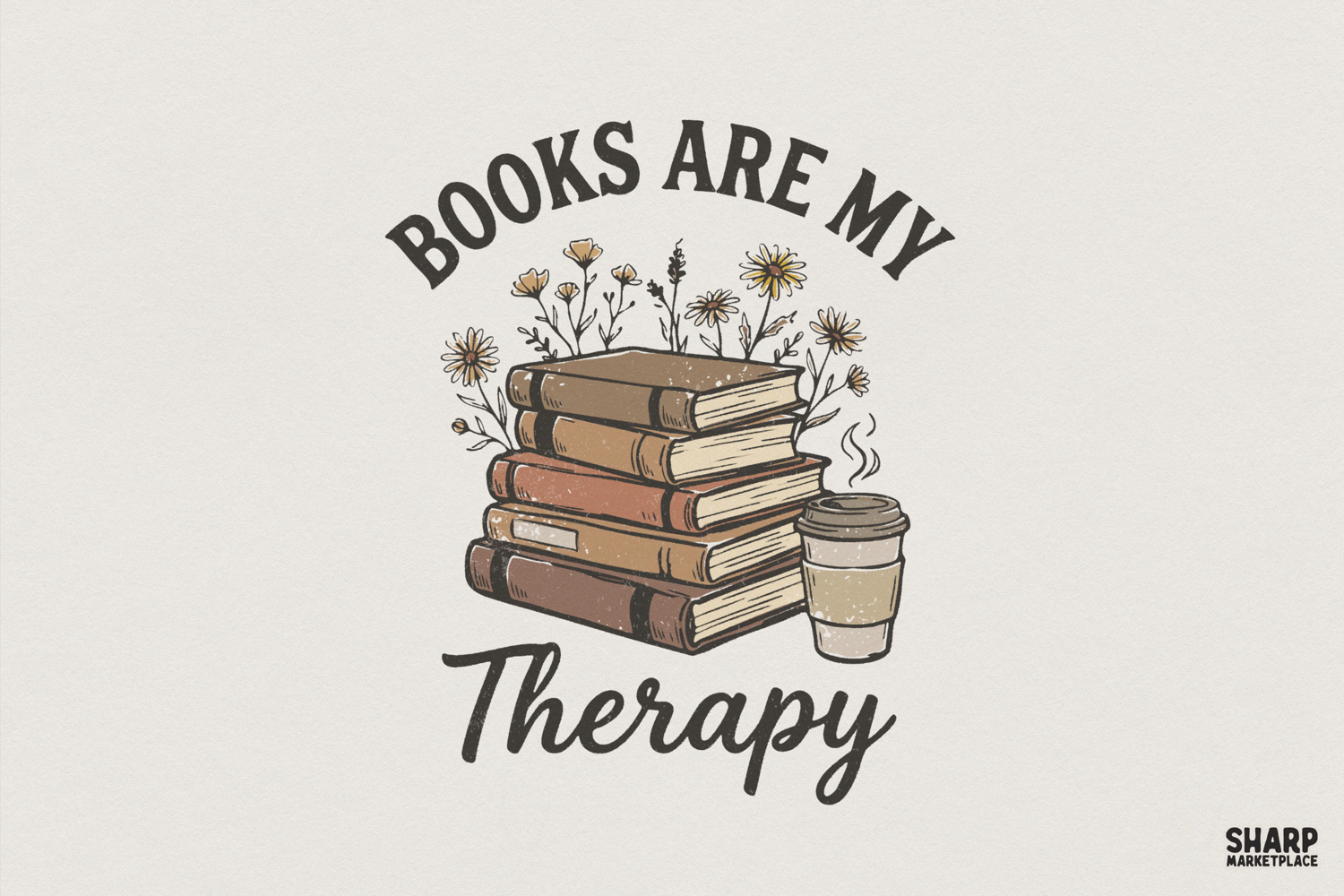 Books Are My Therapy PNG, Stack of Vintage Books with Coffee Mug, Reading Lover Printable, Flower Illustration, Bookish PNG Shirt Design