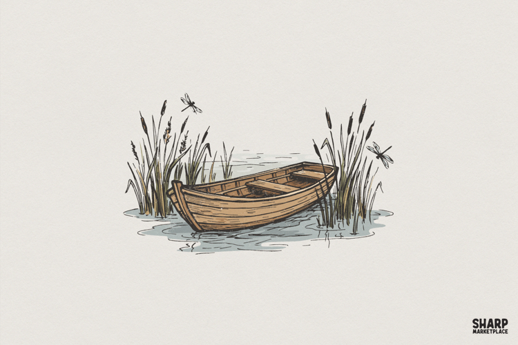Rowboat PNG, Rustic Lake Scene, Vintage Boat Drawing for Shirt, Nature Illustration, Tranquil Water Art Design, Pond Sketch Printable PNG