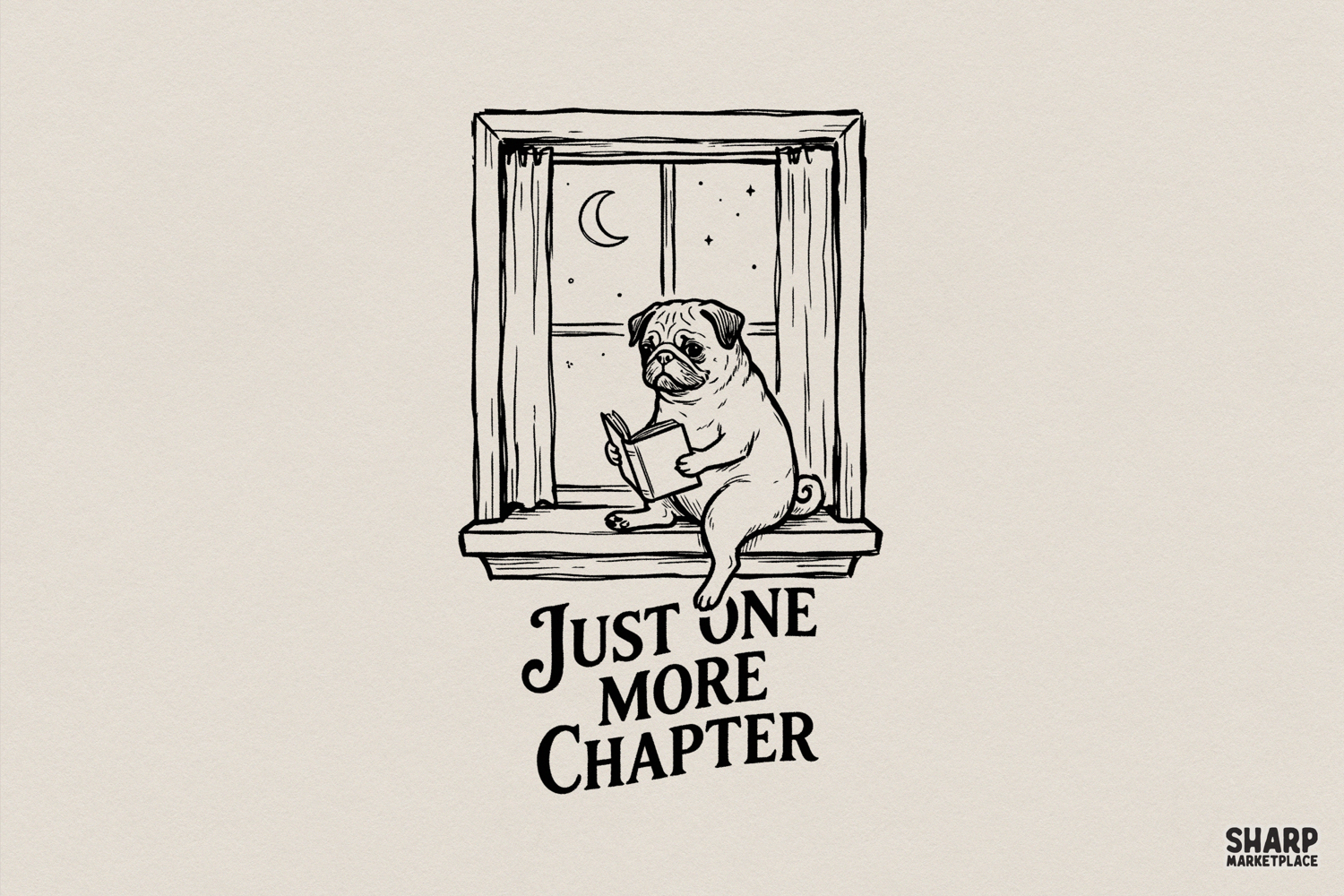 Just One More Chapter PNG, Cute Pug Reading Book Digital Design, Book Lover Shirt Graphic, Dog Humor Printable File, Instant Download