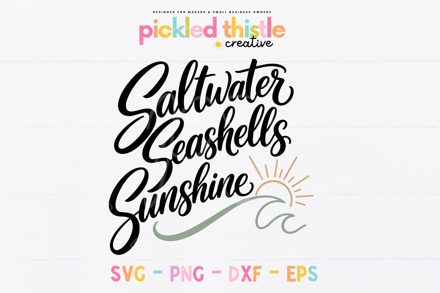 Coastal quote design reading “Saltwater Seashells Sunshine” in bold script lettering with a wave and sun illustration. Clean, flowing typography paired with a beach-inspired graphic.