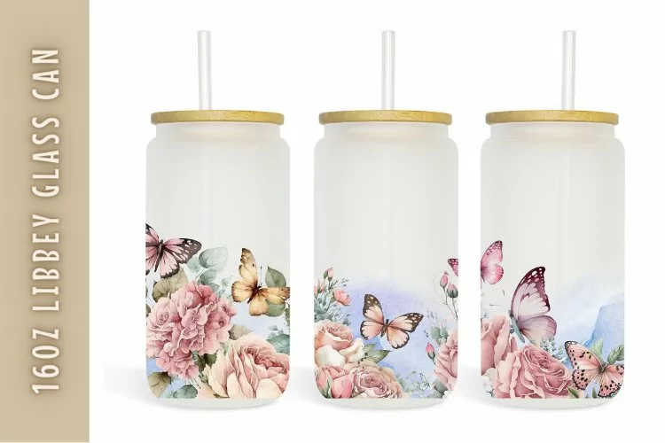 Floral Flower Flowers Watercolor Flowers Butterfly Watercolor Florals Tumbler Wrap Glass Can Wrap Libbey Glass Can Butterfly Floral Watercolor