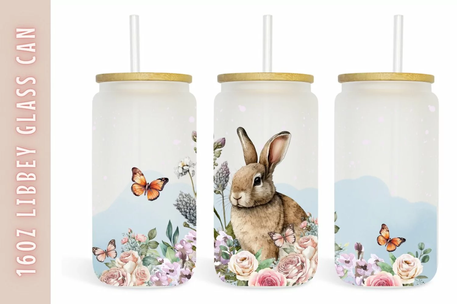 Flowers bunny watercolor tumbler 16oz Libby Glass Can