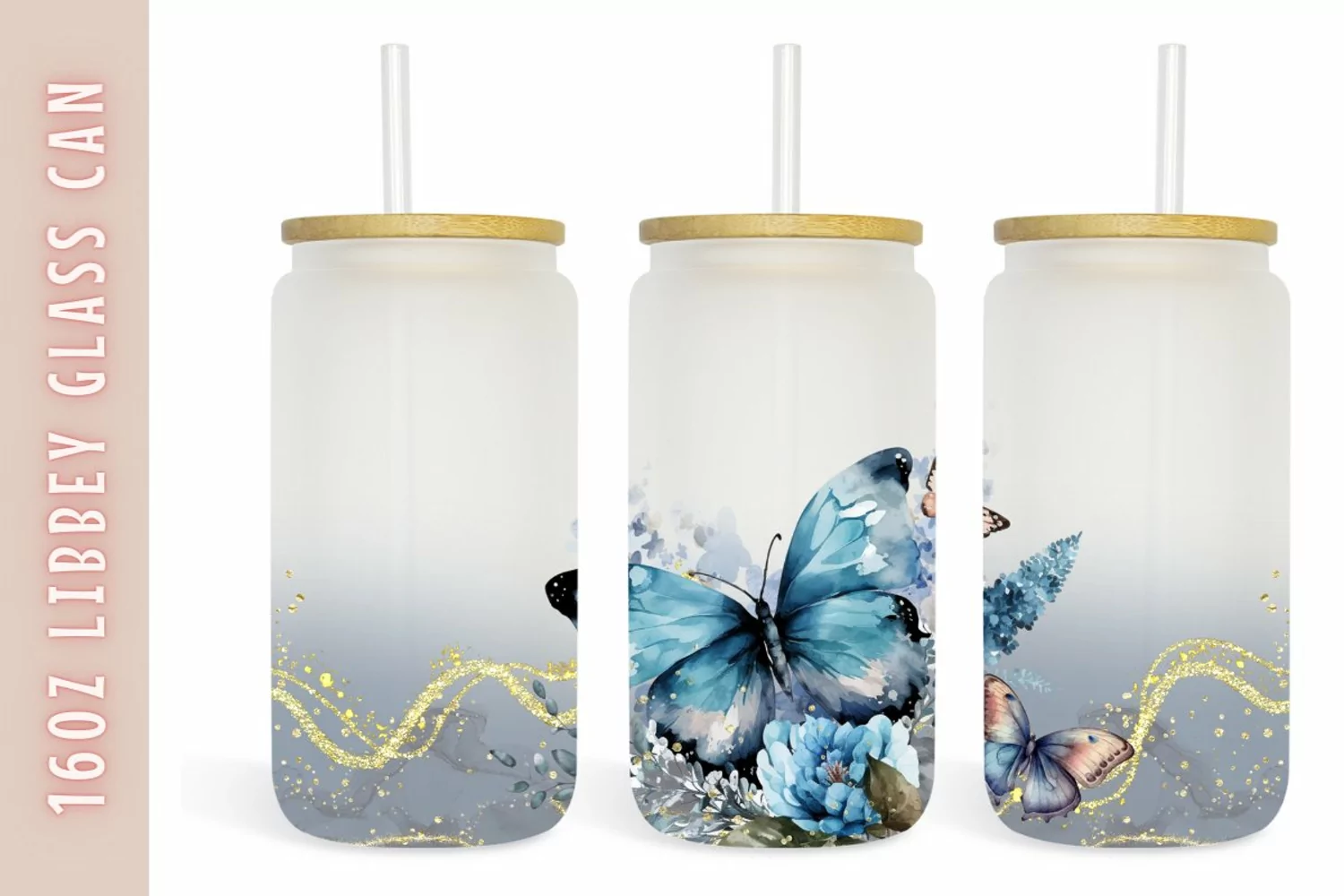 Watercolor flower & butterflies 16oz Libby Glass Can example image 1