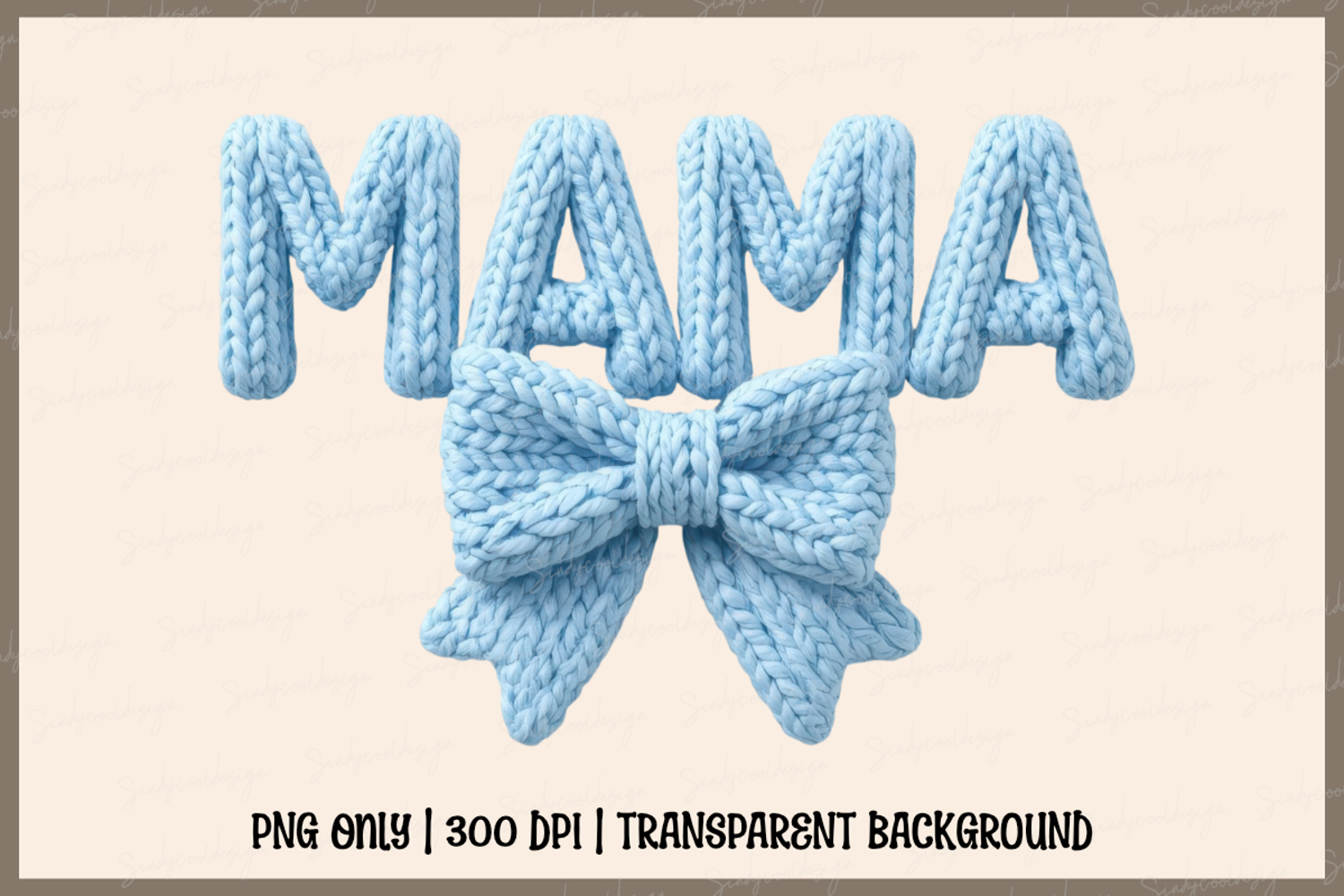 Yarn Texture Lettering Crochet Style Mama Soft Knitted Bow Clipart Chunky Yarn Font Cozy Knitted Typography Handmade Knit Aesthetic Baby Shower Mama Design Cute Yarn Bow Png Cozy Winter Lettering Pastel Blue Yarn Art