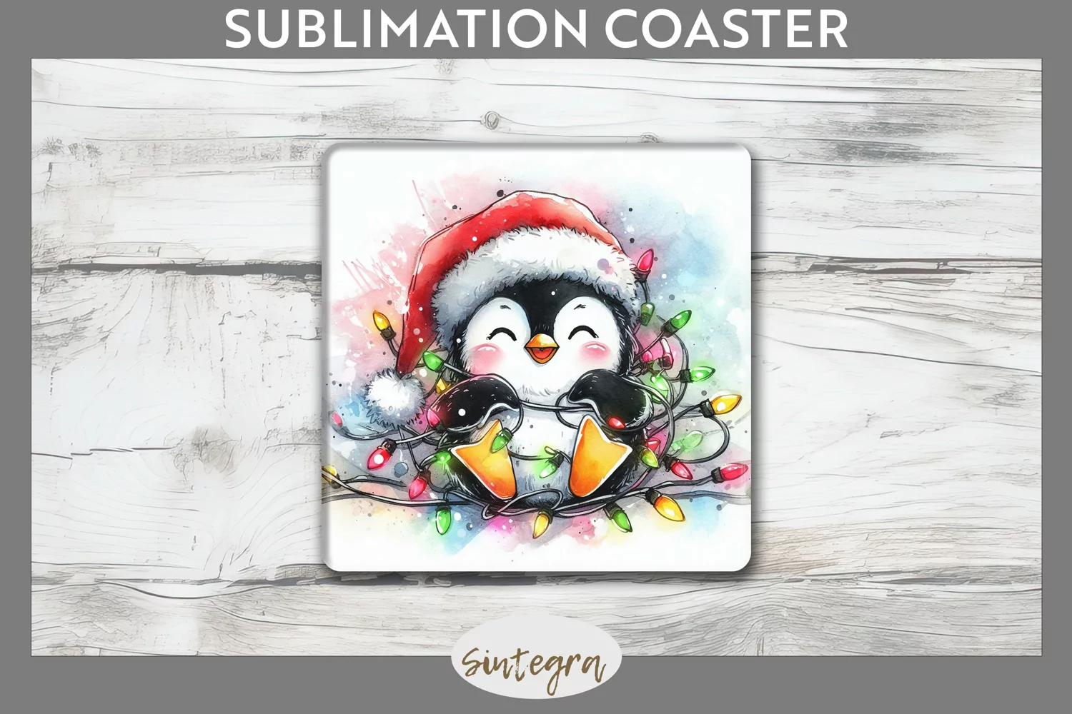 Christmas Penguin v2 Entangled in Lights Square Coaster Subl example image 1