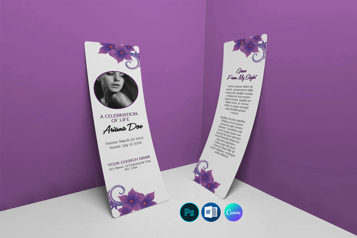 Elegant Funeral Bookmark Template designed to honor and remember loved ones with a beautiful and personalized memorial keepsake. Perfect for funerals, memorials, and celebration of life services.