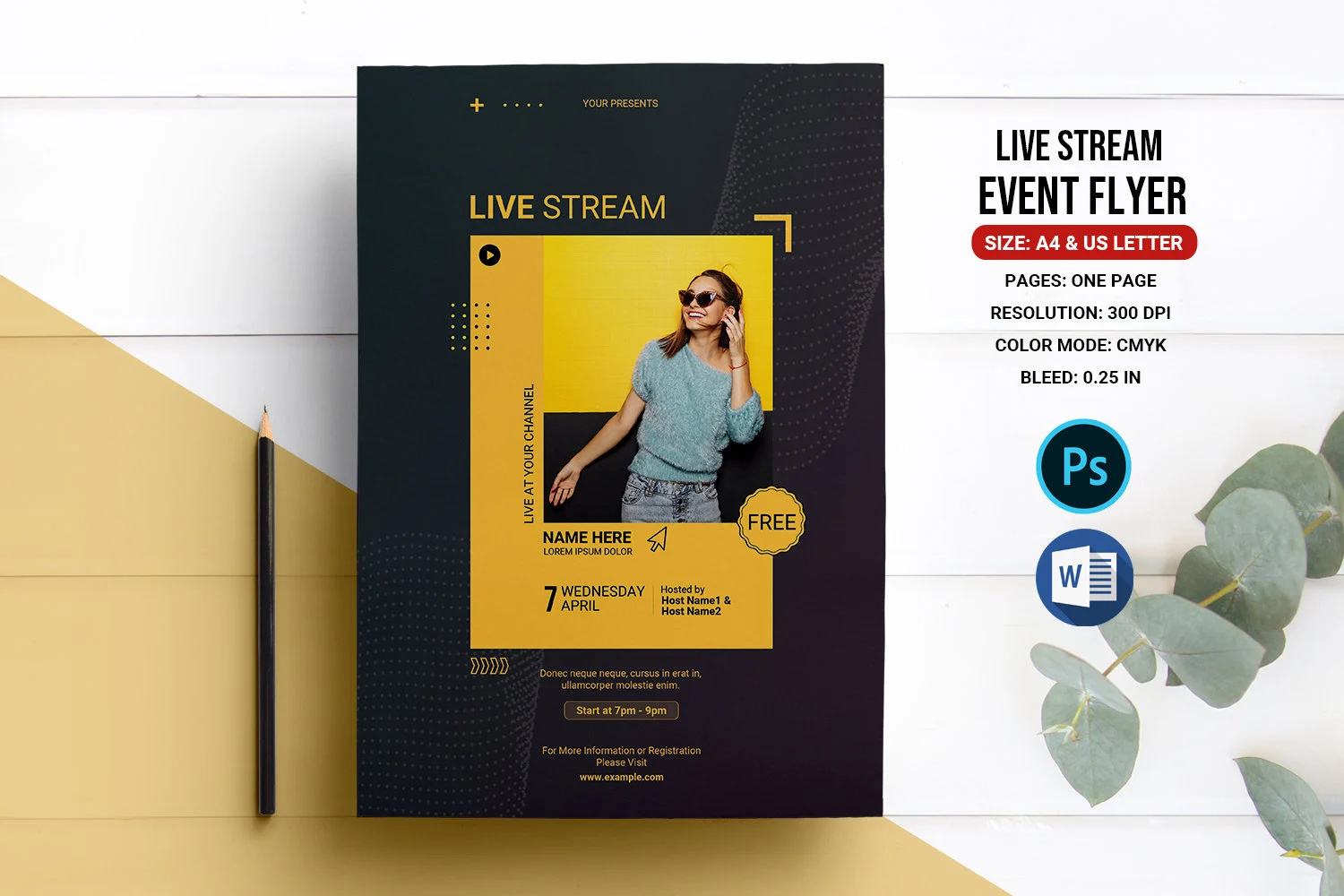 Live Stream Event Flyer Template. All object is in separate layer, grouped and named. Easy to edit, smart object used, easy to replace photo here.This is not mockup