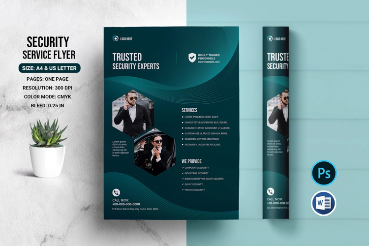 Security Service Flyer Template. All object is in separate layer, grouped and named. Easy to edit, smart object used, easy to replace photo here.
