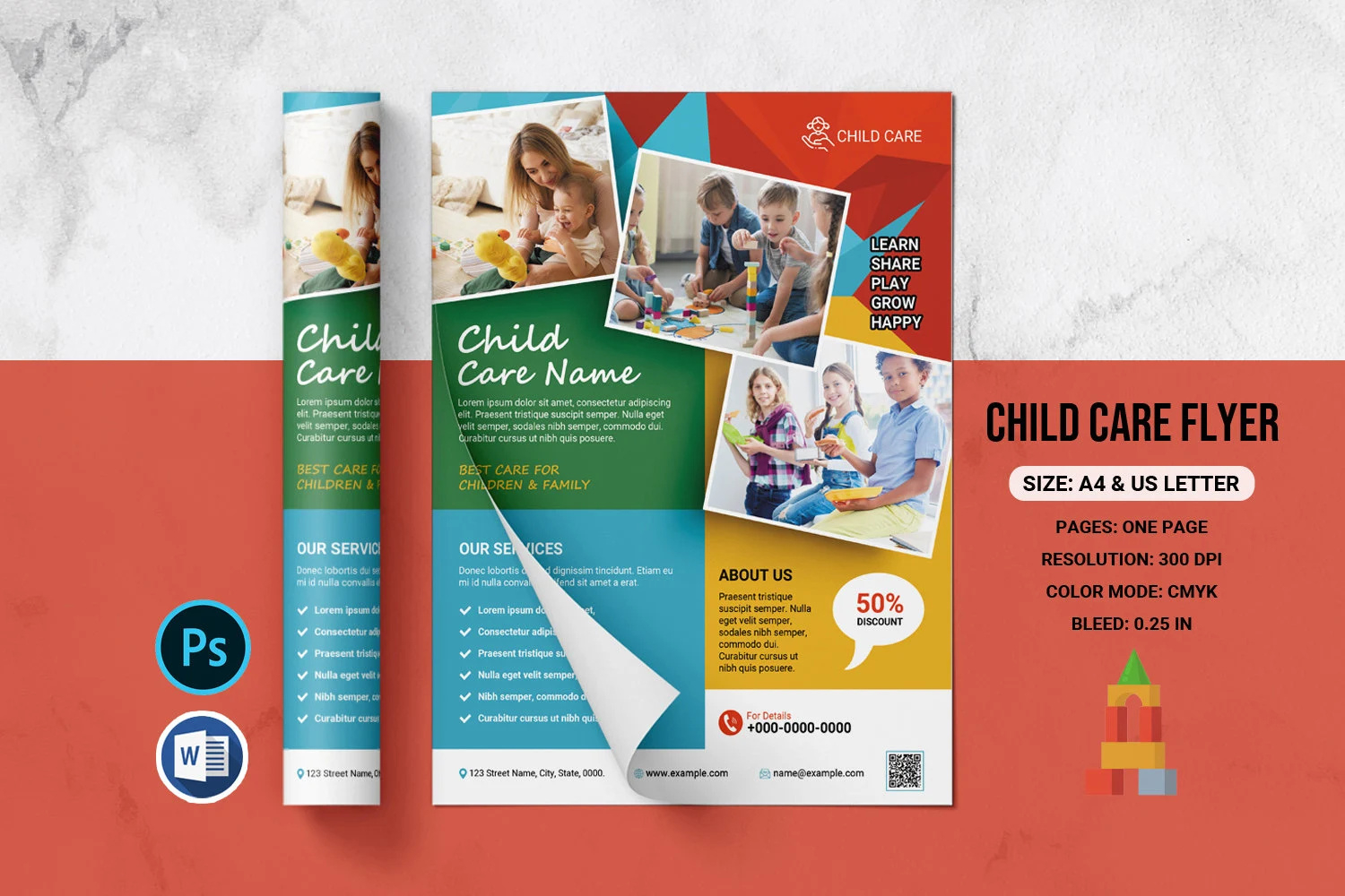 Promote your daycare or babysitting services with this professional Child Care Flyer Template. Perfect for daycare centers, preschool programs, babysitting services, and childcare advertising.