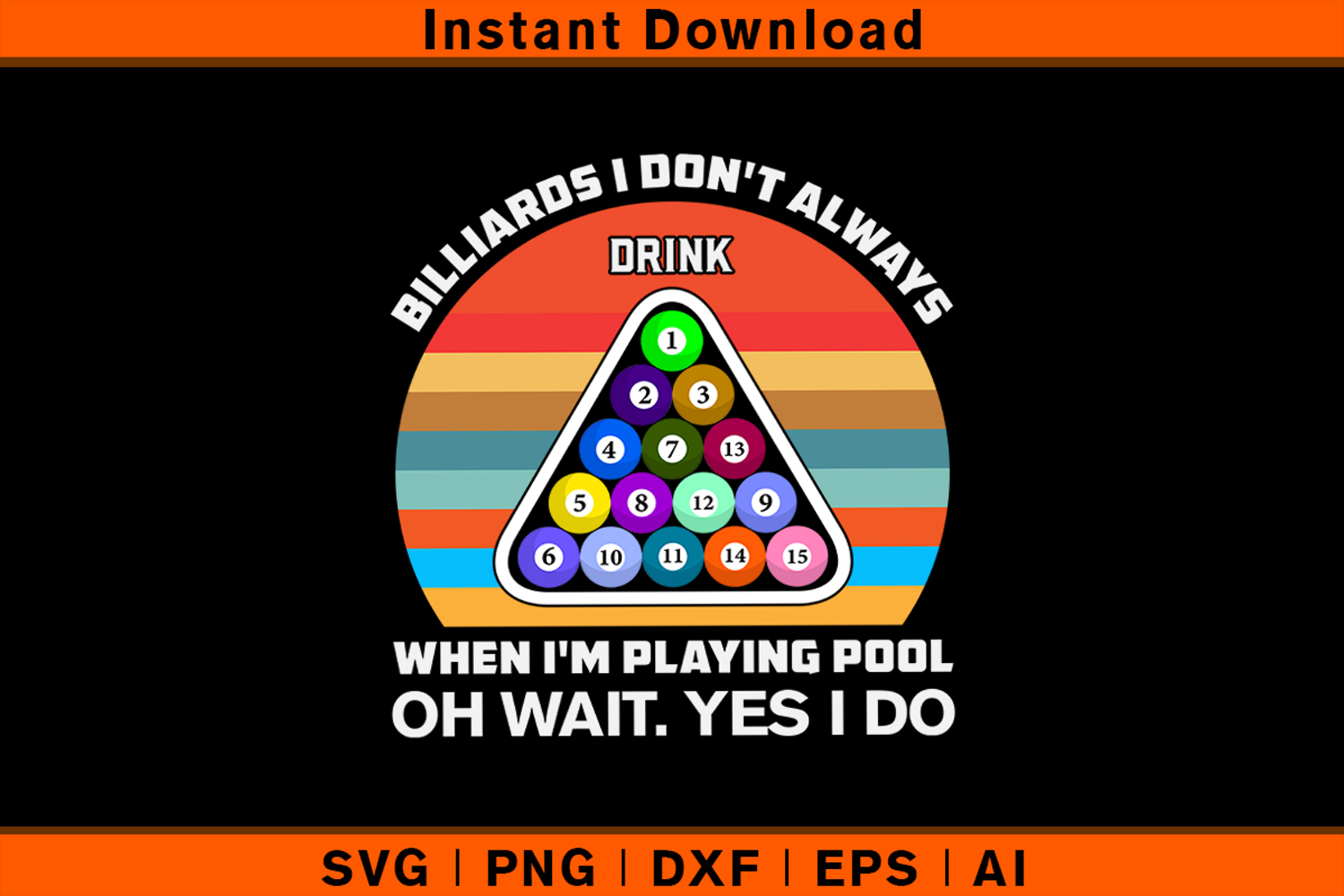 Bring humor to the game with this Billiards Drinking SVG design. Featuring a colorful triangle rack of pool balls over retro stripes with the funny quote “Billiards I Don’t Always Drink When I’m Playing Pool, Oh Wait. Yes I Do”, this design is perfect for pool players who love a laugh. Great for making t-shirts, hoodies, mugs, bar signs, tote bags, and party décor. Ideal for occasions like Father’s Day, birthdays, Christmas, pool tournaments, or bar nights. Works seamlessly with Cricut, Silhouette, and other cutting machines.