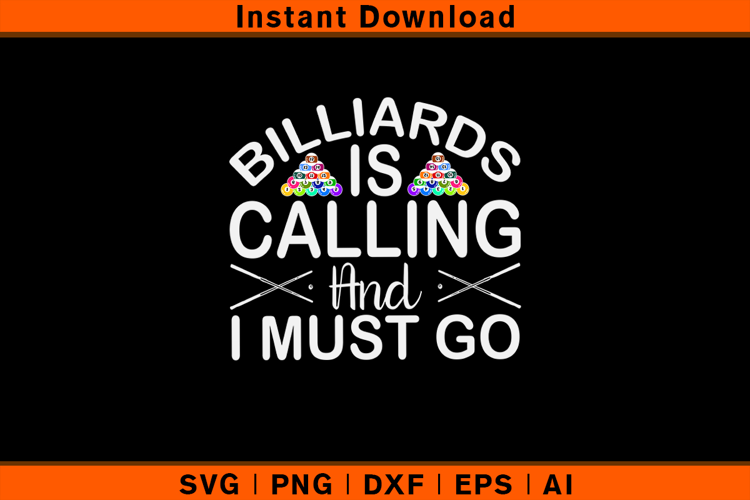 Answer the call of the game with this Billiards Is Calling And I Must Go SVG design. Featuring bold text with triangle racks of pool balls and crossed cue sticks, this design is perfect for billiards lovers and pool hall enthusiasts. Great for customizing t-shirts, hoodies, mugs, tote bags, bar décor, and posters. Ideal for occasions like Father’s Day, birthdays, Christmas, tournaments, or casual game nights. Works seamlessly with Cricut, Silhouette, and other cutting machines.