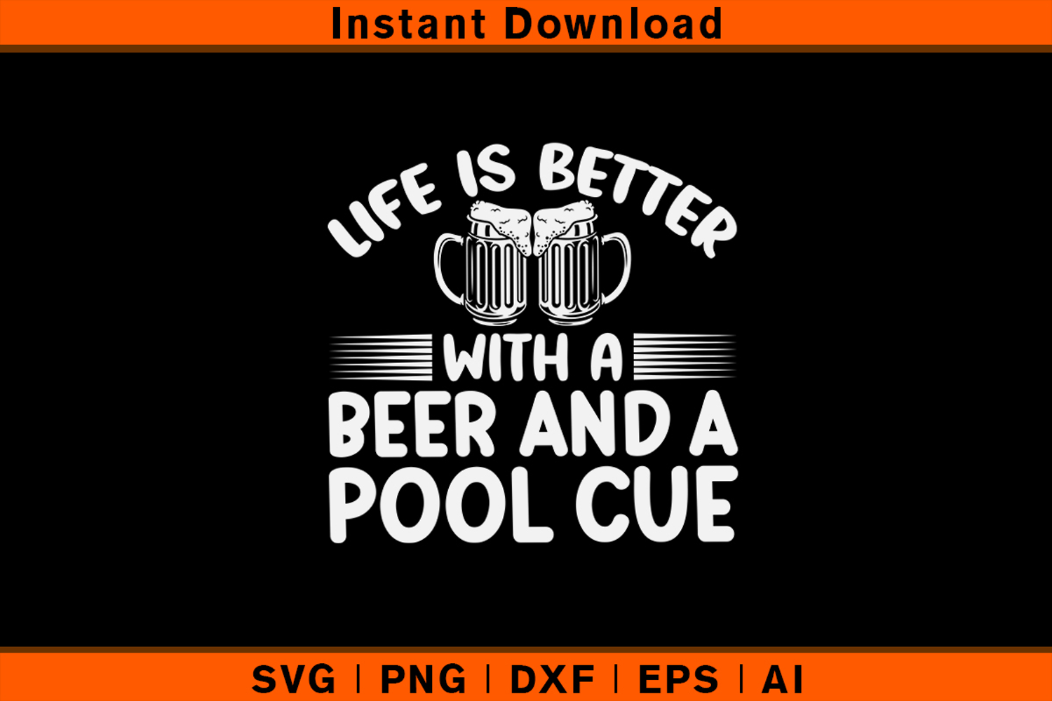 Add humor and personality to your projects with this Life Is Better With A Beer And A Pool Cue SVG, featuring frothy beer mugs and bold pool-themed text. Perfect for creating t-shirts, hoodies, mugs, posters, wall art, and bar décor—ideal for players who love a drink with their game.