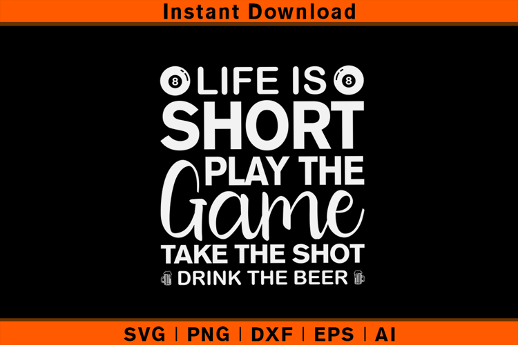 Celebrate the fun side of life with this Life Is Short Play The Game Take The Shot Drink The Beer SVG, a bold and humorous design perfect for pool lovers who enjoy a good drink with friends. Use this design to create t-shirts, hoodies, mugs, posters, bar signs, and wall art décor.