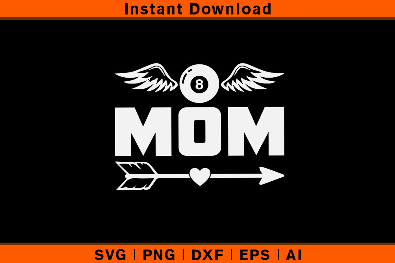 Celebrate moms who love billiards with this Mom Billiards SVG, featuring the word MOM with an 8-ball, angel wings, and a heart arrow design. Perfect for making Mother’s Day gifts, t-shirts, mugs, tote bags, aprons, hoodies, and home décor projects.