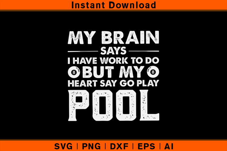 Bring humor and passion for billiards into your crafting projects with this My Brain Says I Have Work To Do But My Heart Says Go Play Pool SVG. This bold, distressed-style typography design featuring 8-ball graphics is perfect for t-shirts, mugs, tote bags, wall art, and custom gifts.