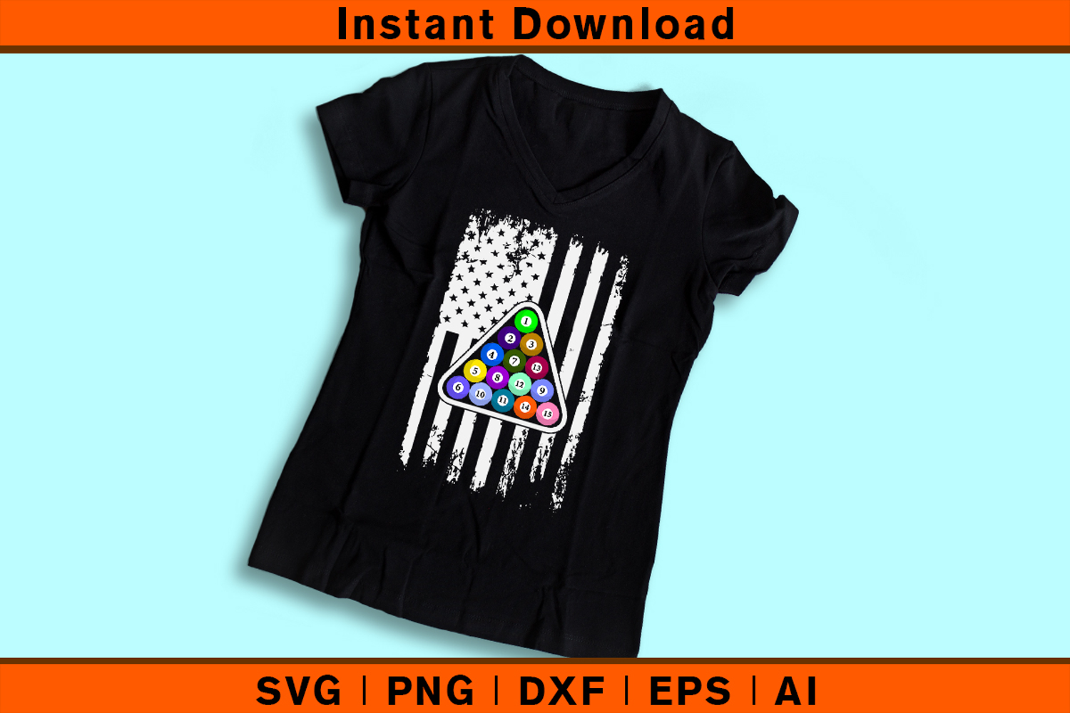 Show off your love for billiards and country with this Billiards American Flag SVG! Featuring a distressed U.S. flag with a rack of colorful pool balls, this design is perfect for t-shirts, hoodies, mugs, tote bags, posters, and wall art. A great way to celebrate both your game and your patriotic pride.