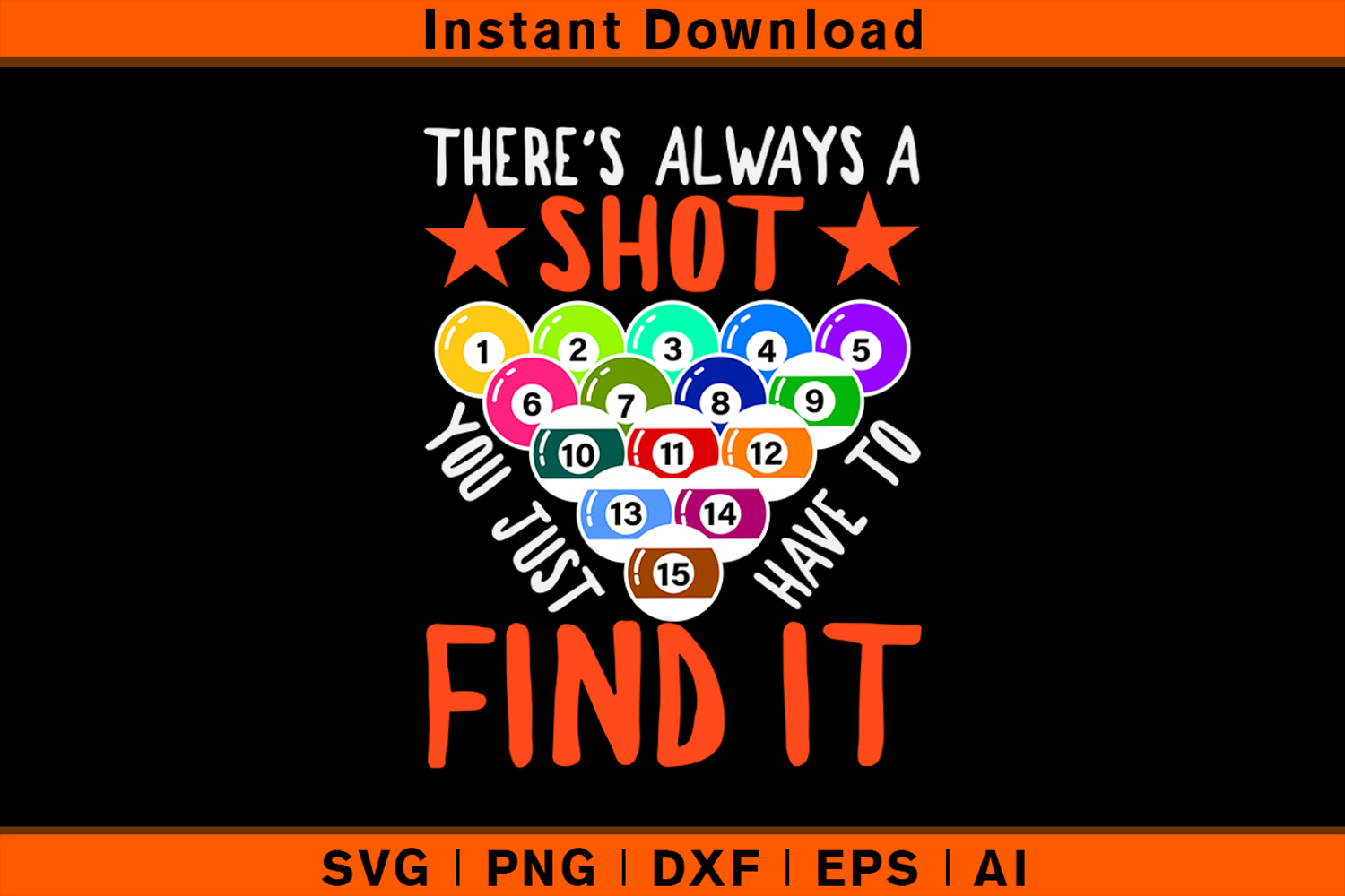 Inspire your inner pool champion with this vibrant "There’s Always a Shot You Just Have to Find It" SVG design! Featuring colorful billiard balls arranged in a classic triangle rack, this motivational and fun design is perfect for pool players and fans who love to showcase their passion for the game. Ideal for t-shirts, hoodies, mugs, tote bags, posters, and more.
