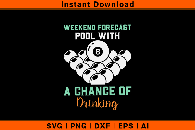 Get ready for a fun-filled weekend with this humorous "Weekend Forecast Pool With A Chance Of Drinking" SVG design! Featuring a classic rack of billiard balls with a bold 8-ball front and center, this design is perfect for pool lovers who enjoy a good time with friends. Ideal for t-shirts, hoodies, mugs, tote bags, posters, and more.