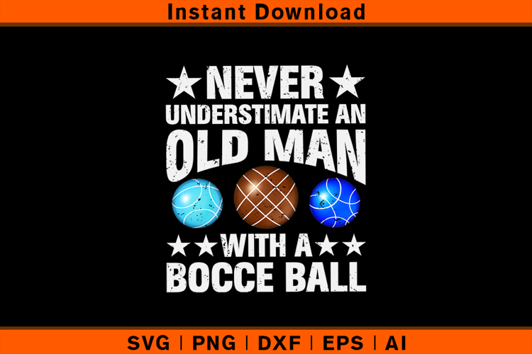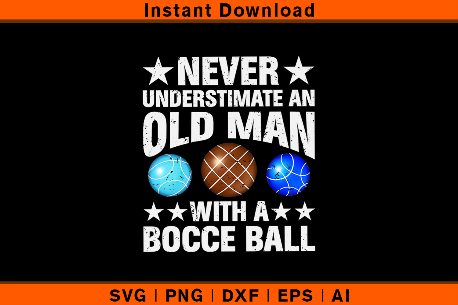 Show your competitive spirit with this bold “Never Underestimate an Old Man with a Bocce Ball” SVG design! Featuring strong vintage typography and three detailed bocce balls in vibrant blue and brown tones, this design is perfect for players who know that age and experience make the best competitors.