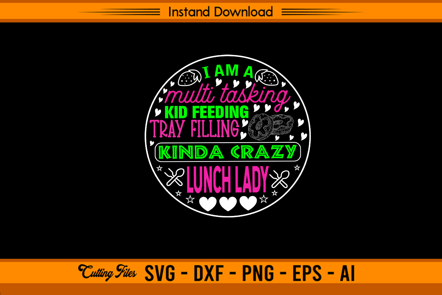Show off your fun, hardworking spirit with this colorful “I Am A Multi Tasking Kid Feeding Tray Filling Kinda Crazy Lunch Lady” SVG design! Perfect for school cafeteria workers, lunch staff, and kitchen teams who make mealtime an adventure every day. This cheerful round layout with heart and utensil accents adds a playful touch to any project — great for shirts, mugs, tote bags, aprons, and staff gifts.