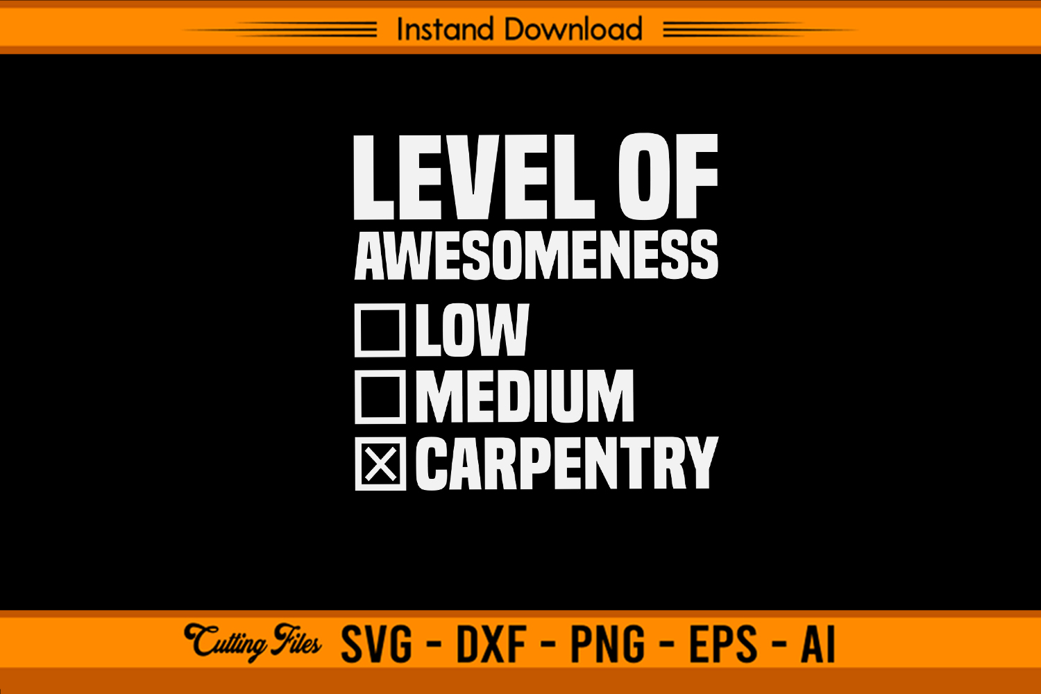 Show your pride in your craft with this Funny Level of Awesomeness Carpentry SVG! Featuring bold block text and checklist-style humor, this design playfully ranks carpentry as the ultimate level of awesomeness — because true craftsmanship speaks for itself.