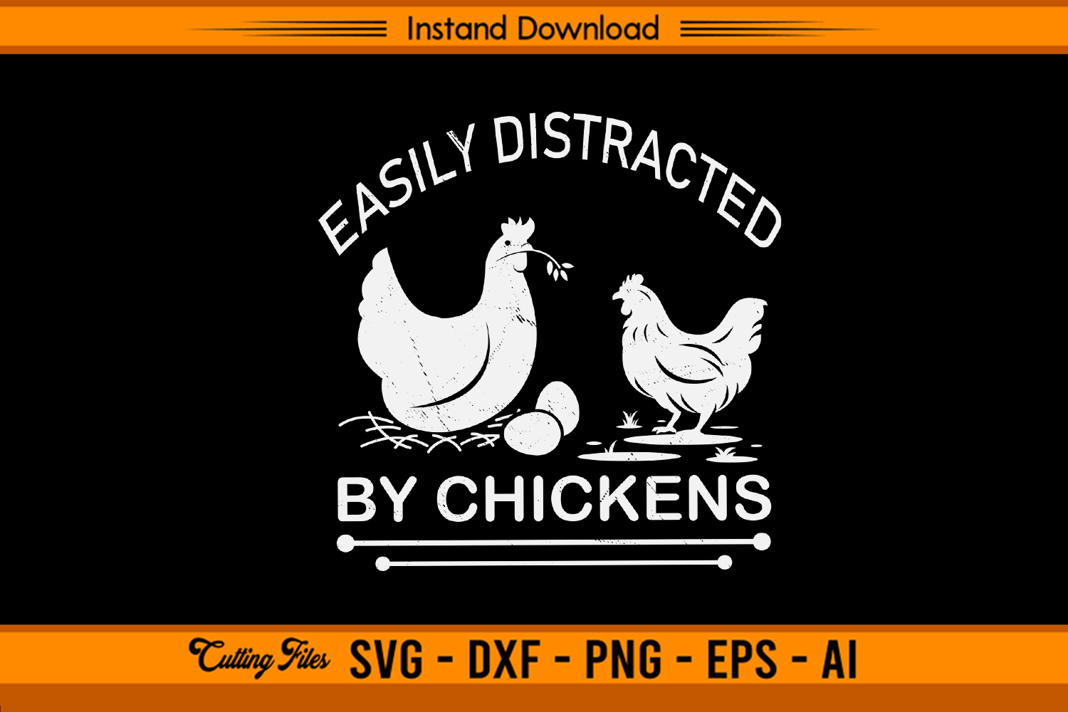 Celebrate your love for your flock with this Easily Distracted By Chickens Funny Farm Life SVG! Featuring charming chicken silhouettes with eggs and a rustic style, this design perfectly captures the humor and joy of backyard chicken keeping.