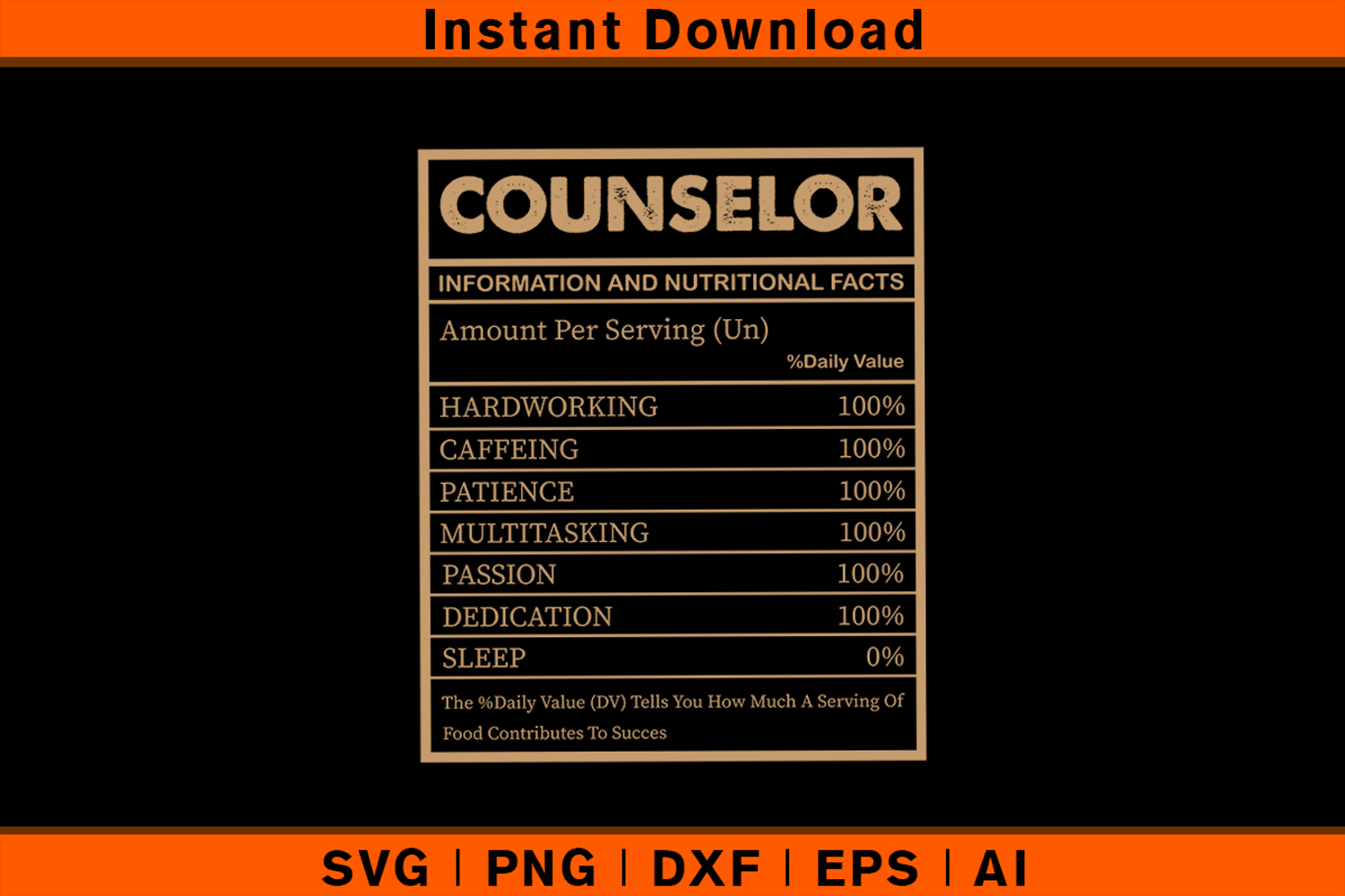 Celebrate the hardworking spirit of counselors with this Counselor Information and Nutritional Facts SVG design! Featuring a fun nutrition-label style layout, it humorously lists key counselor traits like patience, multitasking, and caffeine—all at 100%! Perfect for making t-shirts, mugs, tote bags, or wall art for school counselors, therapists, or anyone who loves their role in helping others.