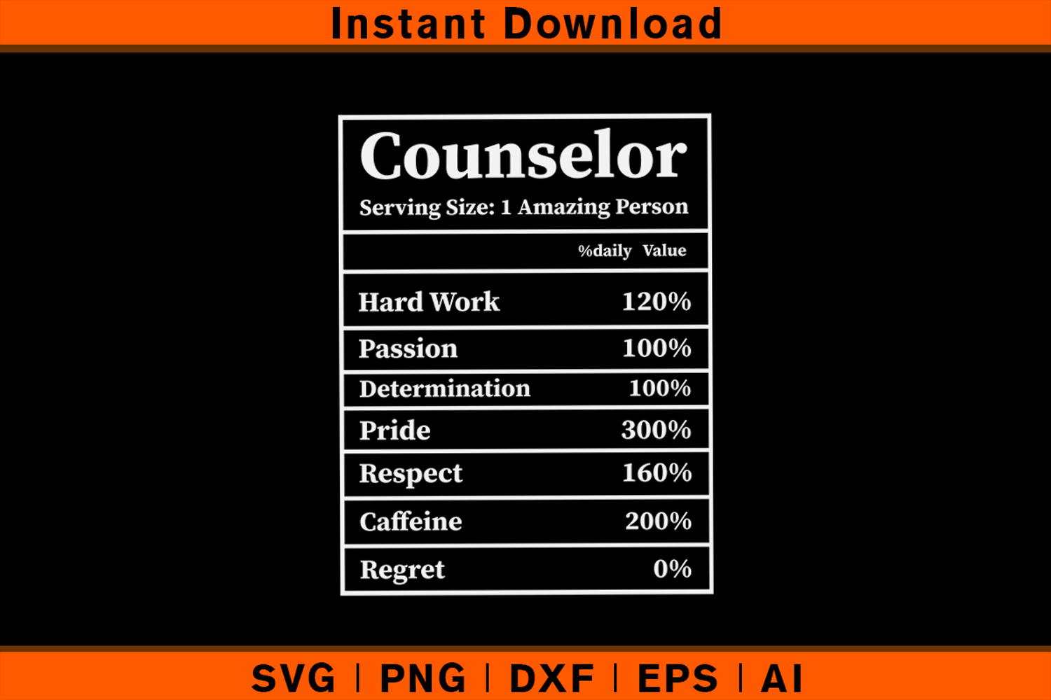 Celebrate the amazing work of counselors with this Counselor Serving Size: 1 Amazing Person SVG design! This clever nutrition-facts-style layout highlights counselor traits like Hard Work, Passion, Pride, and Caffeine—all at 100% or more! Perfect for crafting mugs, shirts, tote bags, wall décor, or gifts for school counselors, therapists, and guidance professionals who make a difference every day.