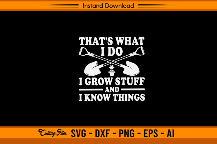 Add some humor to your gardening collection with this That’s What I Do I Grow Stuff And I Know Things SVG! Featuring a fun mix of shovels and a potted plant, this witty design is perfect for gardeners who take pride in their green thumb and a little attitude. Great for shirts, mugs, totes, aprons, and garden signs.