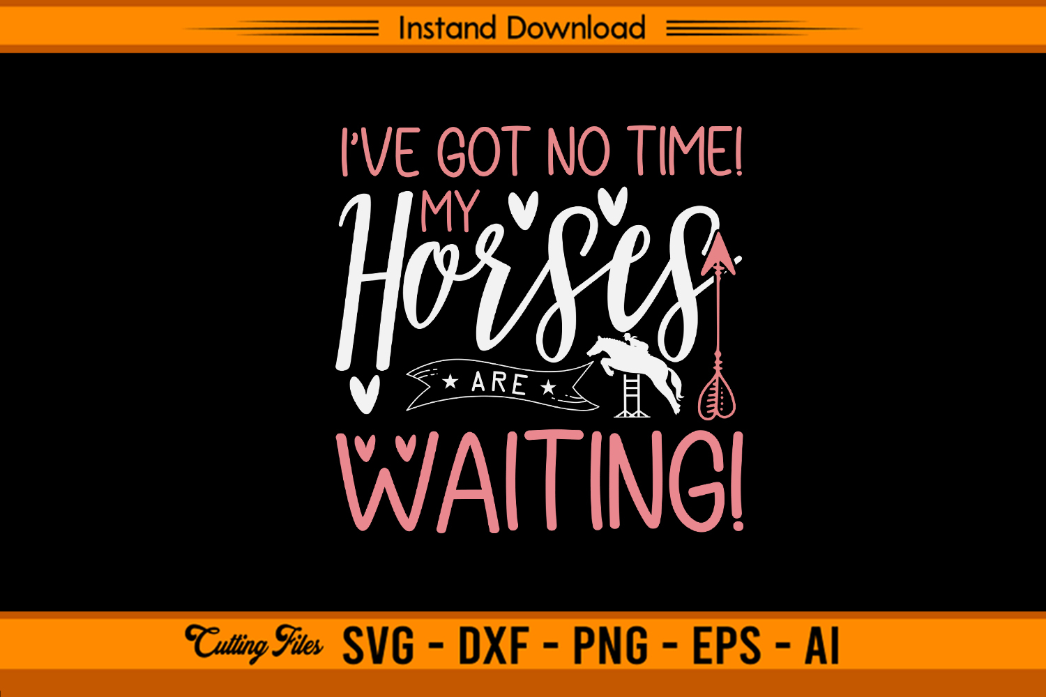 Show off your passion for horses with this fun and stylish “I’ve Got No Time! My Horses Are Waiting!” SVG design! Perfect for every horse lover who’d rather be out riding than doing anything else. The design features playful lettering, heart accents, and a horse jumping graphic for the perfect equestrian touch.