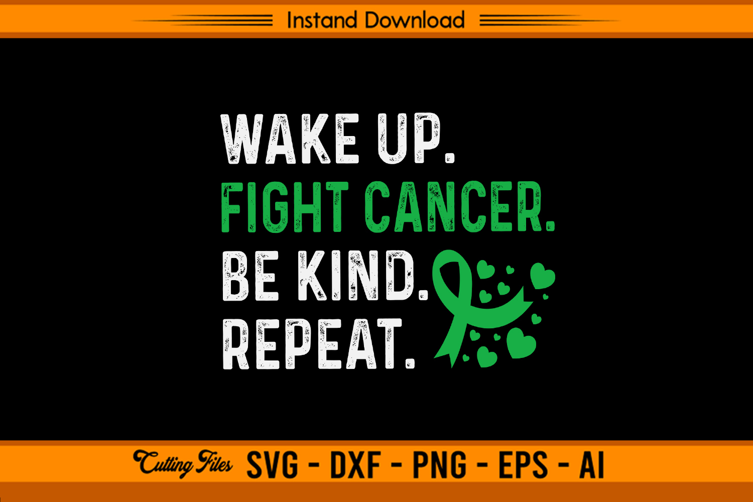 Spread positivity and strength with this “Wake Up, Fight Cancer, Be Kind, Repeat” Liver Cancer Awareness SVG design. Featuring bold green and white distressed text with a heart-accented ribbon, this design inspires resilience and compassion every day. Perfect for creating t-shirts, mugs, tote bags, and posters using Cricut or Silhouette machines.