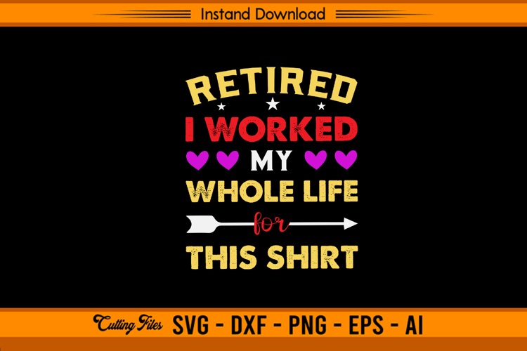Celebrate your hard-earned retirement with this Retired I Worked My Whole Life For This Shirt SVG design. Featuring bold, colorful text with stars, hearts, and an arrow accent, this funny and cheerful design perfectly captures the pride of reaching retirement. Great for creating T-shirts, mugs, tote bags, pillows, and other fun DIY crafts. Compatible with Cricut, Silhouette, and all major cutting machines.