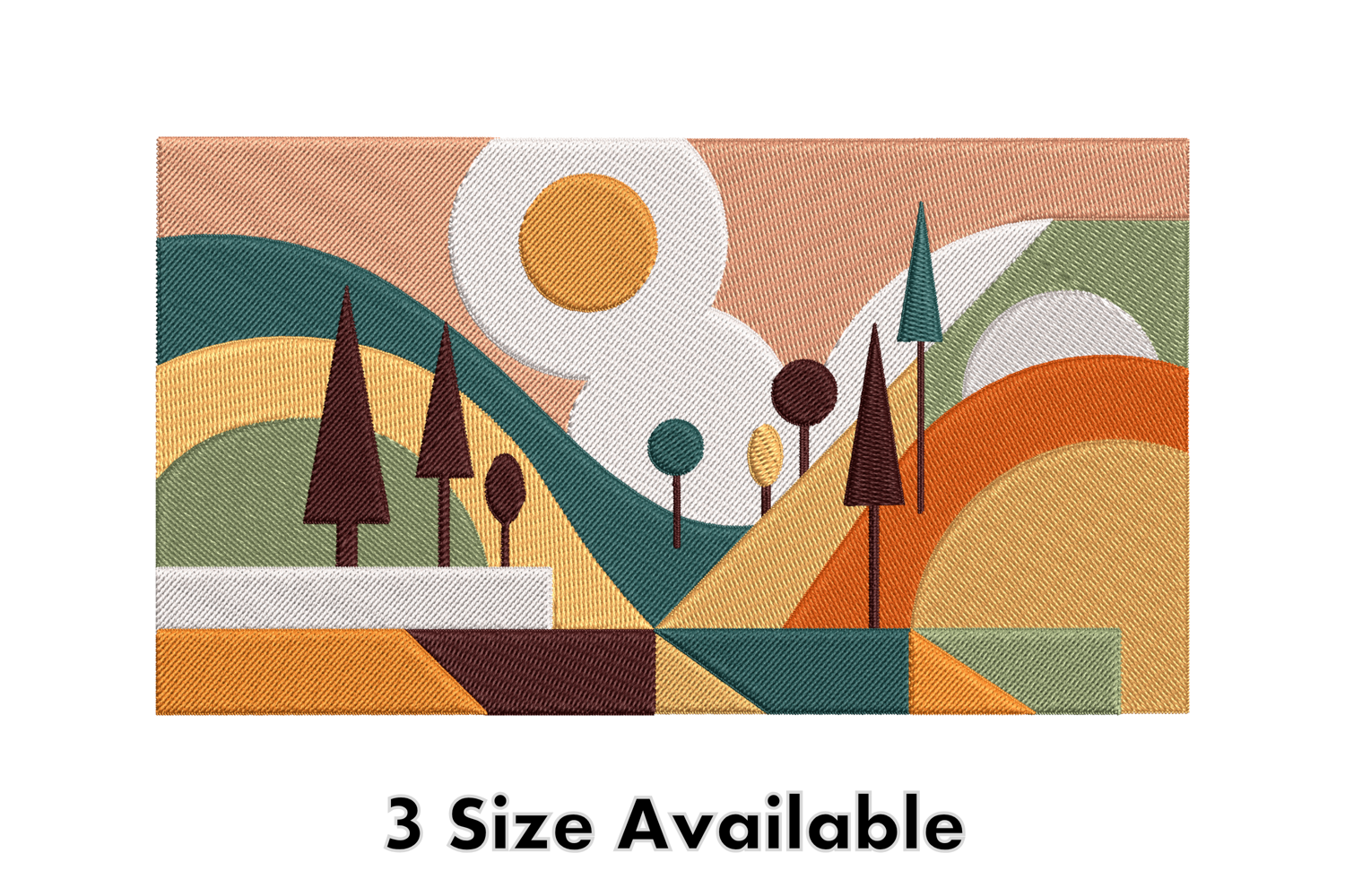 Add modern artistry to your embroidery collection with this Geometric Landscape Scene Embroidery Design. Featuring an abstract landscape with trees, sun, and hills in warm earthy tones, this design combines nature with bold geometric shapes for a unique visual effect. Perfect for T-shirts, tote bags, pillows, hoodies, and other fabric projects. Ideal for all USA popular holidays and occasions including Thanksgiving, Christmas, Halloween, Easter, New Year, Valentine’s Day, Mother’s Day, Father’s Day, weddings, birthdays, anniversaries, and seasonal celebrations.