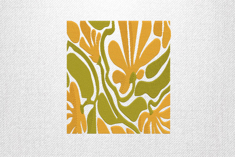 This Abstract Yellow Green Floral Embroidery Design combines flowing organic shapes with bold yellow petals and olive-green leaves, creating a modern and stylish botanical look. Its seamless blend of colors makes it perfect for vibrant, nature-inspired embroidery art.