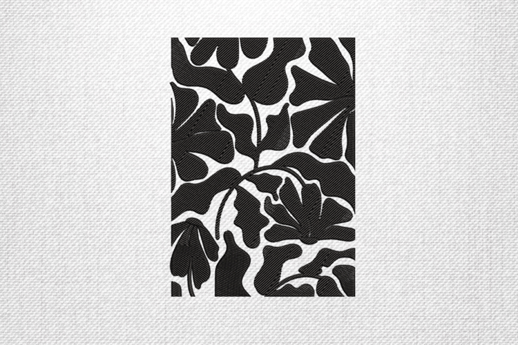 This Black Botanical Leaf Abstract Embroidery Design features a sophisticated arrangement of overlapping leaf shapes in bold black, forming a stunning modern pattern. The intricate leaf silhouettes create a balanced, high-contrast composition ideal for fashion, accessories, and home Decor.