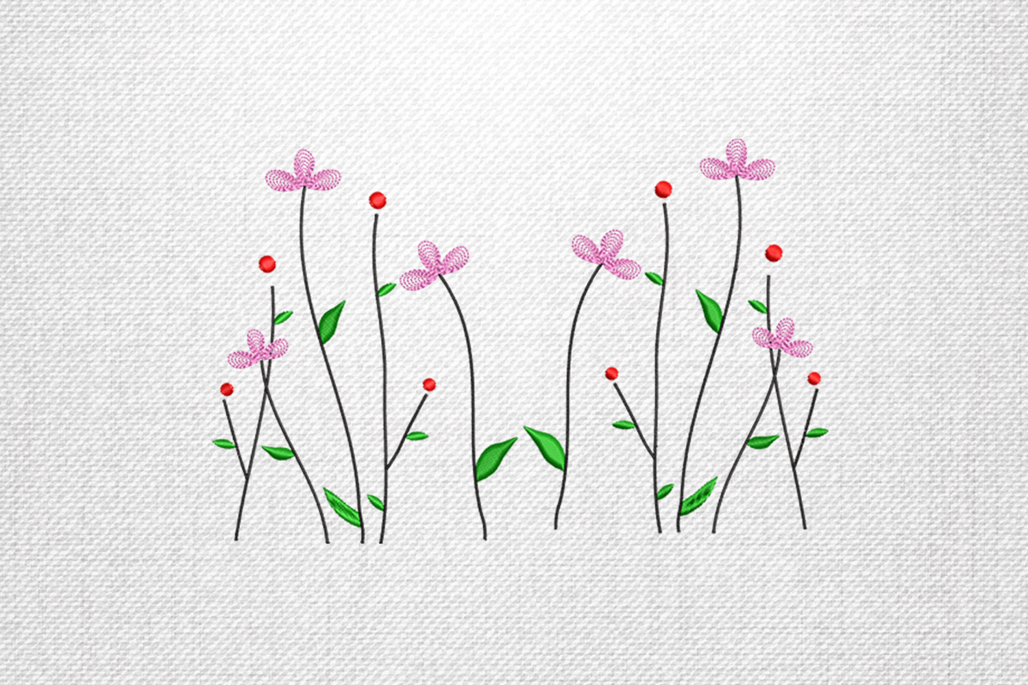 This Pink Wildflower Line Embroidery Design showcases a delicate arrangement of pink flowers with slender black stems, tiny red buds, and fresh green leaves. Its minimalist and elegant style makes it perfect for adding a soft floral charm to your embroidery projects.