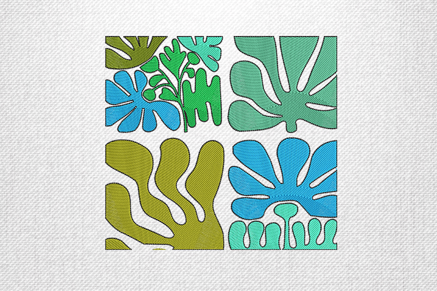 This Tropical Leaf Block Abstract Embroidery Design showcases a fresh botanical composition featuring bold shapes and lush tropical leaves in shades of blue, green, and lime. The modern square layout adds an artistic, contemporary touch, perfect for creating eye-catching embroidery projects inspired by nature.