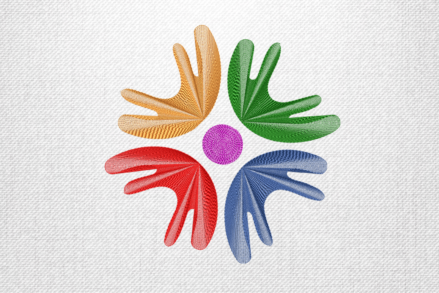 This Colorful Abstract Floral Mandala Embroidery Design features four vibrant leaf-like shapes in red, orange, green, and blue, circling around a bright magenta center. The smooth satin stitches and symmetrical balance create a cheerful, eye-catching embroidery piece ideal for modern textile projects and festive creations.