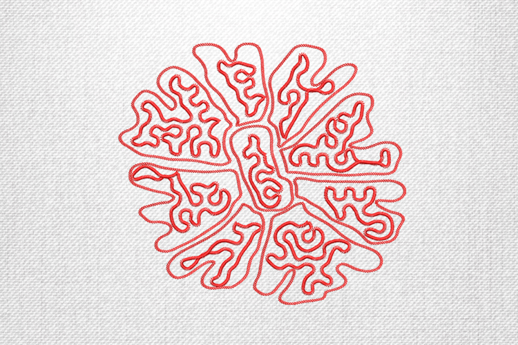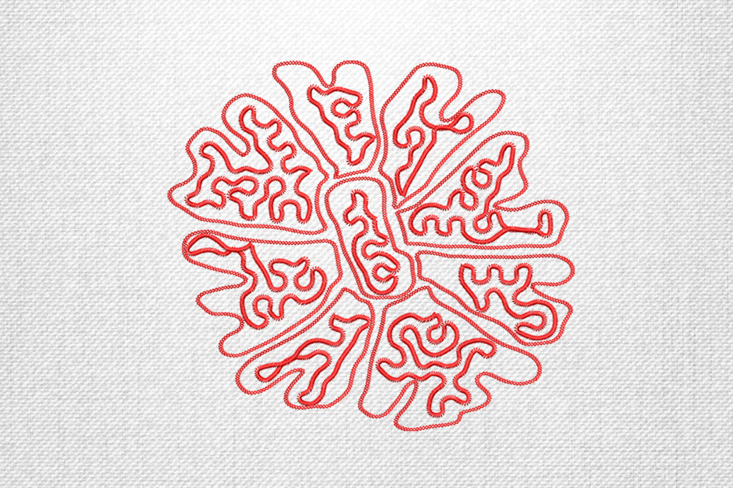 This Abstract Red Floral Line Embroidery Design features an intricate circular pattern made entirely of continuous red stitches, creating a modern and artistic flower-like motif. The symmetrical and abstract structure gives it a bold yet elegant appearance, perfect for creative embroidery projects.
