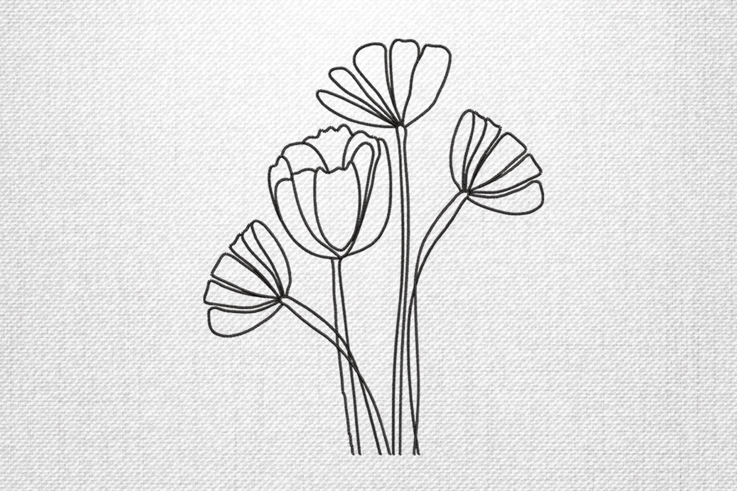 This Minimalist Wildflower Outline Embroidery Design showcases a delicate cluster of blooming wildflowers, stitched with smooth black linework for a clean and modern look. Its graceful curves and simple structure bring a natural and elegant touch to any embroidery project.