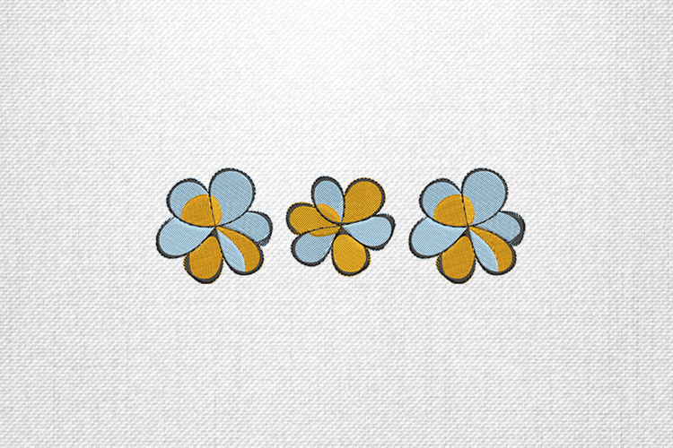 This Triple Petal Mix Embroidery Design showcases three charming flowers stitched in a soothing blend of light blue and golden yellow. Each flower has a unique petal twist, outlined in clean black stitching for a refined, modern look. Perfect for minimal yet artistic embroidery creations.