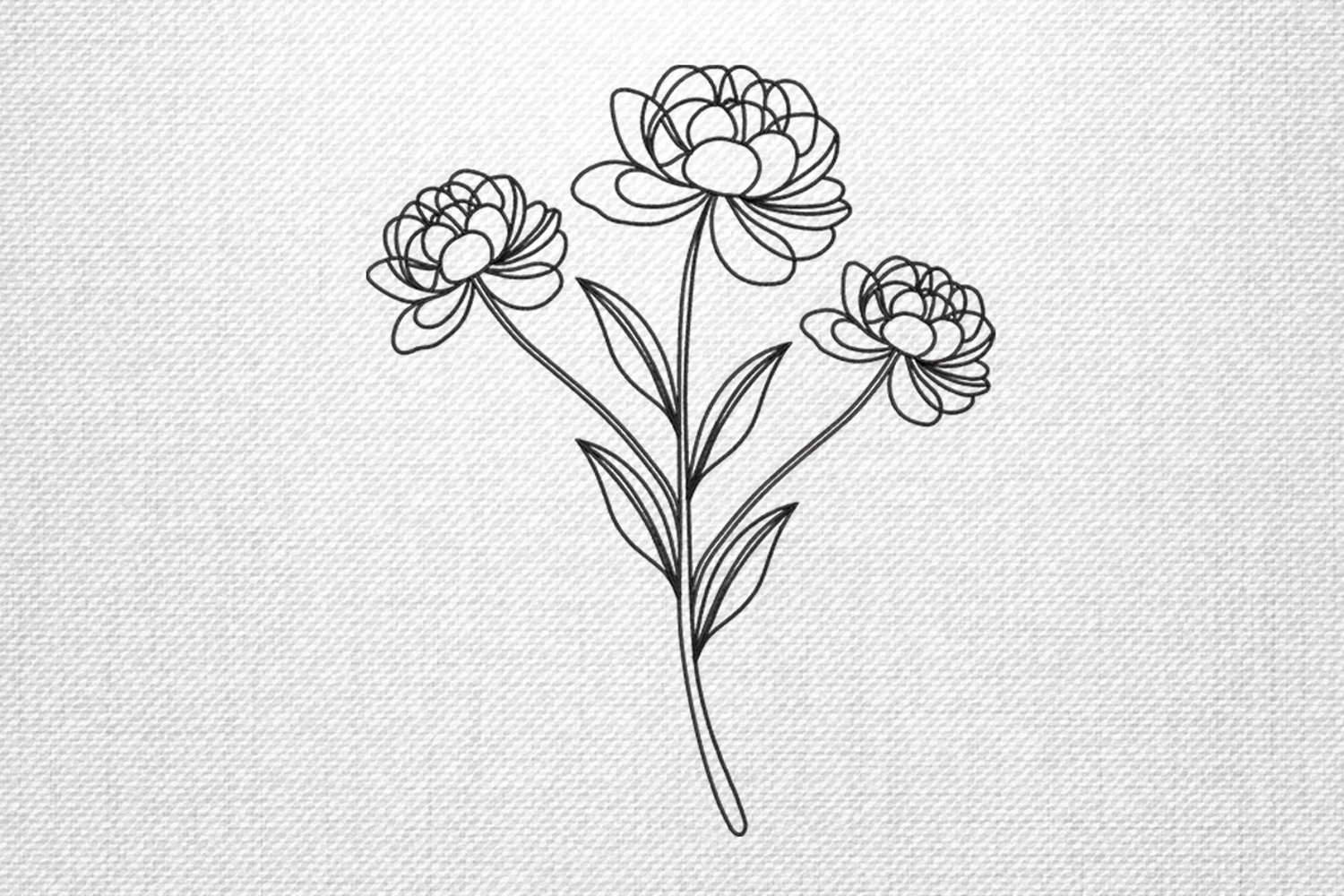 This Triple Bloom Outline Floral Embroidery Design showcases three beautifully layered flowers with graceful petals and delicate leaves. The clean black linework creates a refined and versatile floral motif that complements any project, blending modern simplicity with timeless beauty.