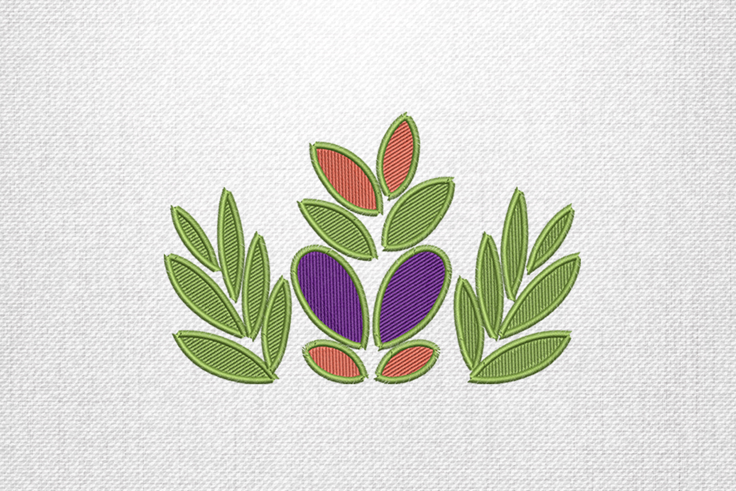 This Colorful Leaf Cluster Abstract Embroidery Design features a modern arrangement of bright green leaves accented with purple and coral details. The combination of smooth satin stitches and clean edges adds a touch of bold creativity to your embroidery collection.
