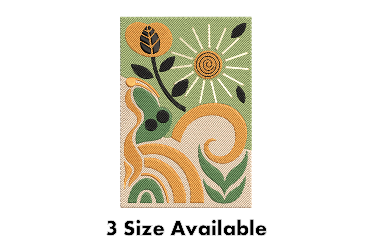 This Abstract Sun and Leaves Modern Embroidery Design features an artistic blend of sun rays, swirling curves, and leaf elements in calming shades of gold, green, and black. The balanced abstract composition adds a stylish, nature-inspired feel to any embroidery project, perfect for modern and minimalist creations.