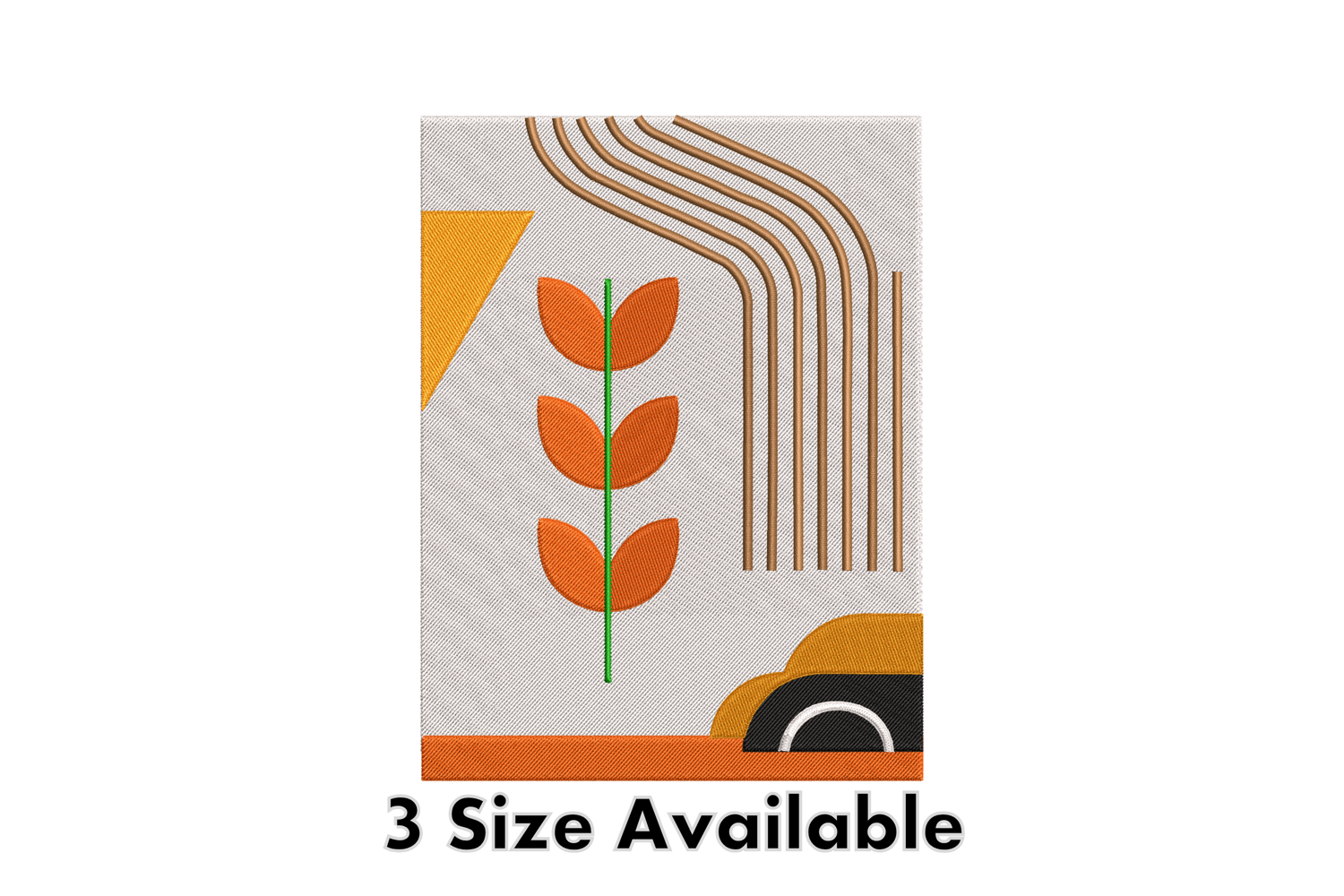 This Modern Leaf & Line Abstract Embroidery Design features a unique combination of curved lines, geometric shapes, and stylized orange leaves with a touch of green stem detailing. The balanced layout and warm earthy tones make it a perfect design for contemporary embroidery enthusiasts.