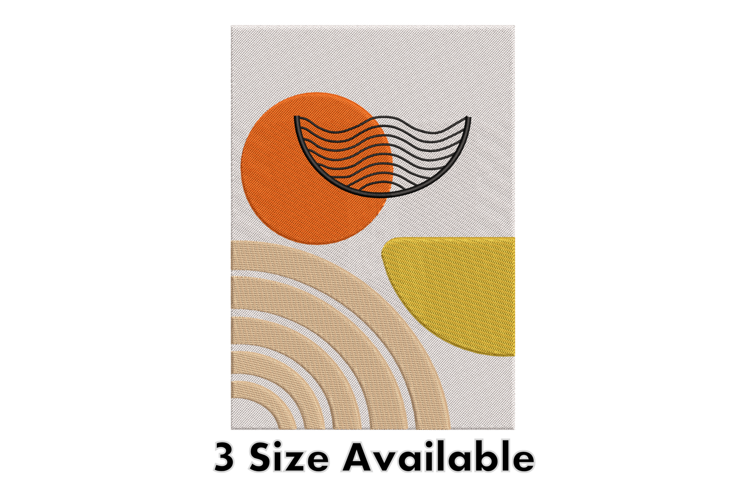 This Abstract Minimal Wave Art Embroidery Design combines modern shapes and elegant lines to create a visually calming geometric composition. Featuring a warm orange circle, yellow half-moon, and soft curved arcs, it brings together simplicity and balance inspired by nature and modern art.