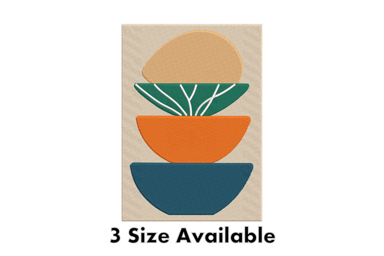 This Stacked Geometric Bowls Embroidery Design presents a clean and balanced modern composition featuring three colorful half-bowl shapes in blue, orange, and tan tones, accented by organic white line details. The minimalist layering effect creates a sophisticated, nature-inspired aesthetic perfect for lovers of geometric and abstract embroidery art.