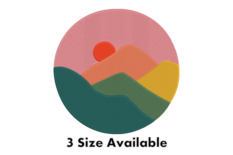 This Colorful Sunset Mountain Landscape Embroidery Design captures the serene beauty of nature with a modern artistic twist. Featuring layered mountains in green, mustard, and peach tones under a warm pink sky with a vibrant red sun, this circular design adds elegance and tranquility to any fabric. Perfect for wall art, apparel, tote bags, and nature-inspired décor projects.