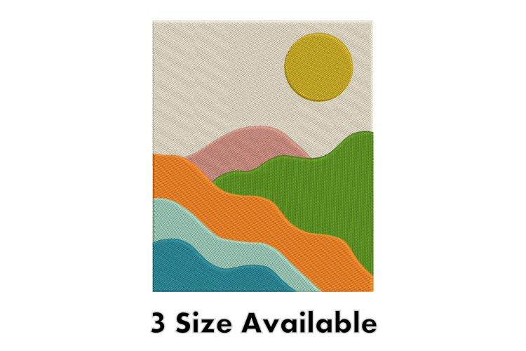 This Colorful Sunset Landscape Embroidery Design showcases layered waves of color inspired by nature’s sunset palette. With flowing hills in green, orange, pink, and blue beneath a radiant yellow sun, this design captures a modern and artistic landscape feel that adds vibrance to any project.